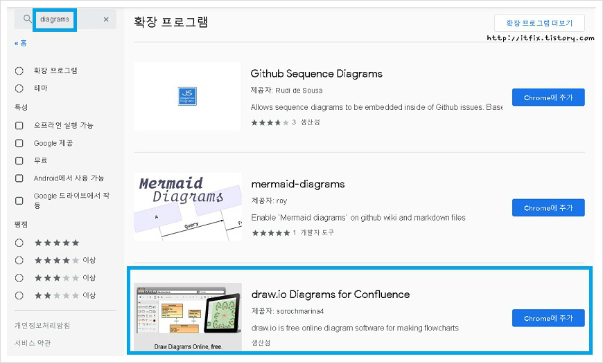 크롬 웹 스토어에서 왼쪽 상단 검색창에 diagrams라고 칩니다. 세 개의 앱이 검색되는 데, 그중 가장 아래에 있는 앱을 선택하여 크롬에 추가시킵니다.