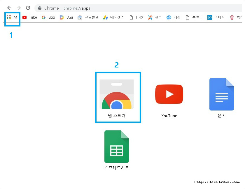 크롬을 열고 좌측 상단의 앱 표시 아이콘을 클릭한 뒤 본문중 큰 아이콘 모양의 웹 스토어 아이콘을 클릭합니다.