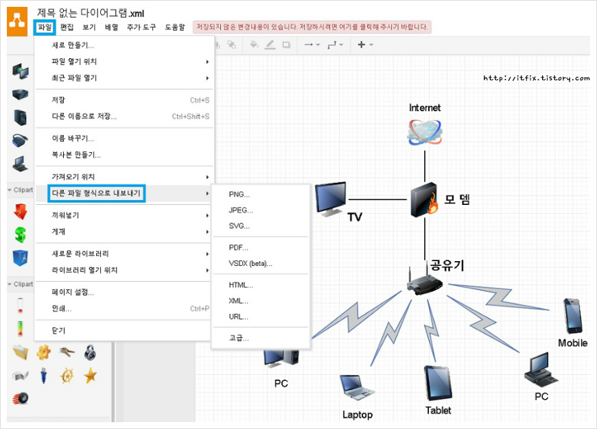 기본적으로 xml파일로 클라우드 또는 pc 등에 저장하여 나중에 수정이 가능한데, 다른 파일 형식으로 내보내기를 선택하여 이미지 형식 또는 pdf파일로 저장도 가능합니다.