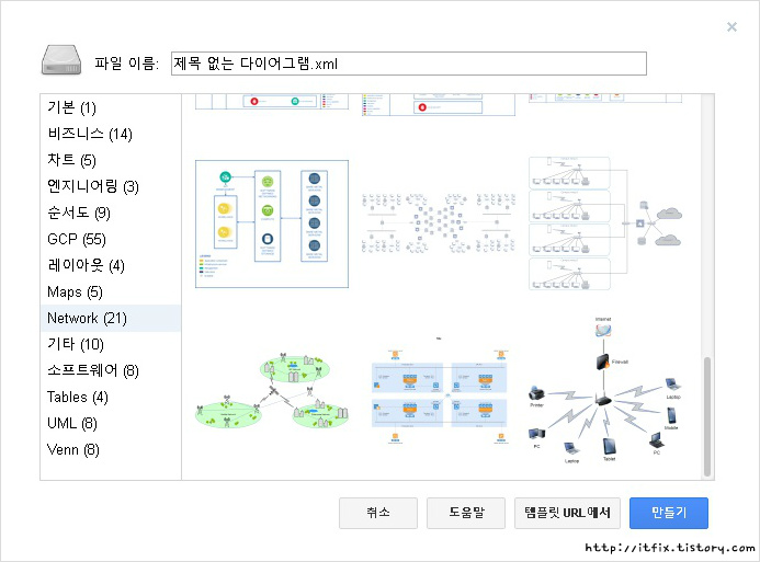 다음 화면부터는 한국어로 진행되는데 안 바뀔 경우 새로고침을 해주면 됩니다. 다음 단계에서 새로운 다이어그램 작성을 클릭하면 저장될 xml파일의 이름을 정할 수 있고, 미리 작성되어 있는 50여 가지의 분야별 폼이 준비되어 있는 창이 뜹니다.