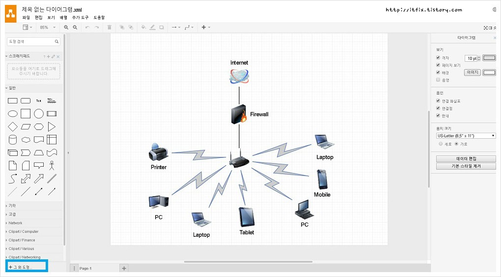 실제로 작업을 해보기 위해 네트워크 항목 21개의 준비된 서식중 제일 아래의 네트워크 흐름도를 선택했습니다. 작업은 대충 조정하고 글 삽입하고 하는 작업만 했는데 직관적이고 쉬운 인터페이스로 인해 금방 마칠 수 있었습니다. 회로도 작업 파트도 마련되어 있어 전자, 전기 분야 회로도를 급조하셔야 하는 분들에게도 유용해 보였습니다.