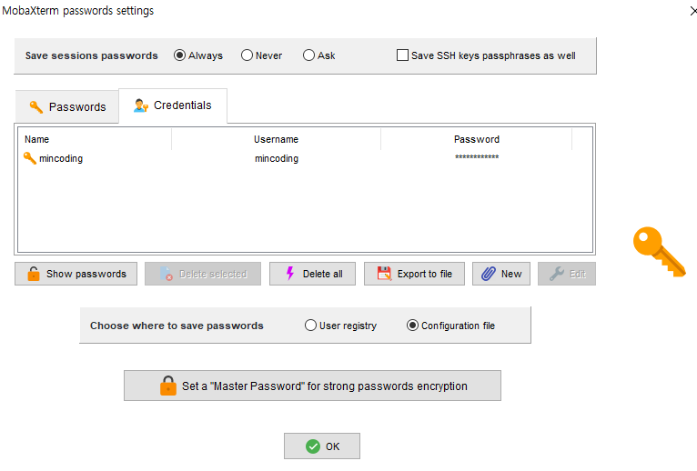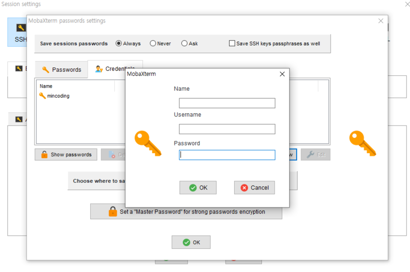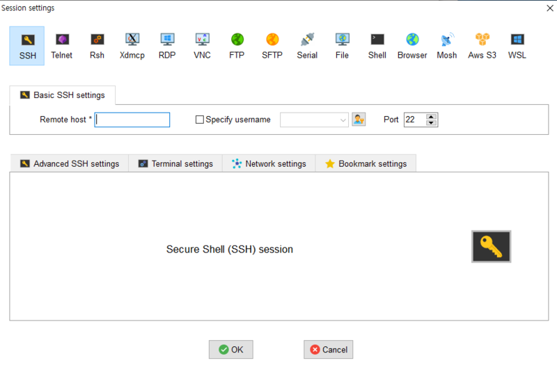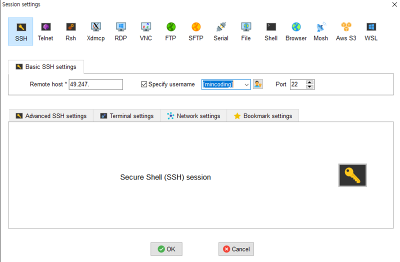 Secure Shell Protocol 을 사용하기 위해서 열쇠 모양이 그려진 SSH 아이콘을 클릭한다.
