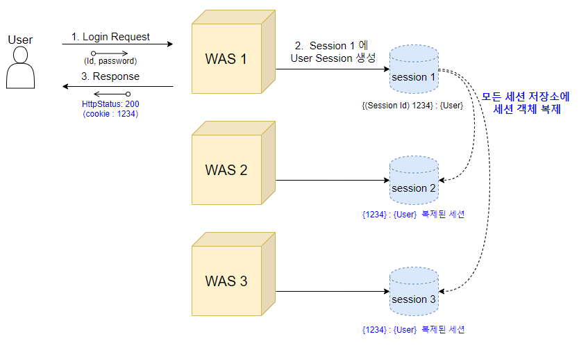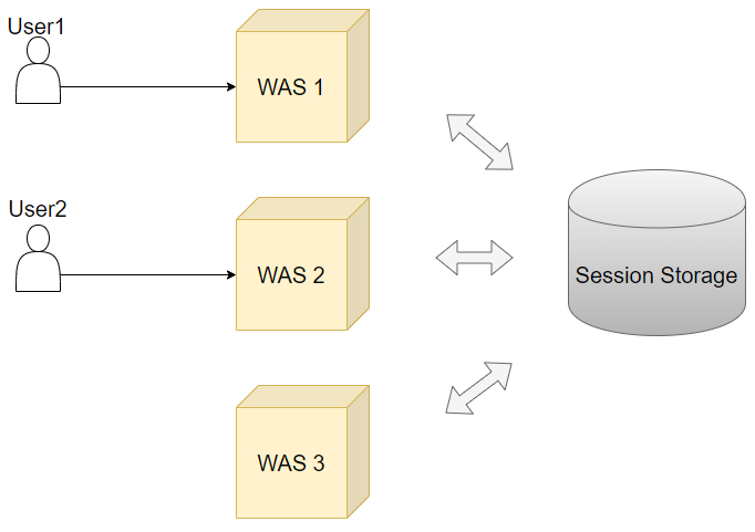 위와 같이 세션 스토리지가 분리되면 서버가 아무리 늘어난다고 할 지라도 세션 스토리지에 대한 정보만 각각의 서버에 입력해주면 세션을 공유할 수 있게된다. 이러한 방식을 사용한다면 트래픽이 비정상적으로 몰리는 현상을 고려하지 않아도 되고, 서버 하나가 장애가 발생하더라도 별도의 세션 저장소가 존재하기 때문에 가용성을 확보할 수 있다. 뿐만 아니라 여러 대의 서버가 하나의 세션을 이용하기 때문에 개별적으로 갖고있던 로컬 세션 저장소의 데이터 불일치가 발생하지 않는다. 단, 하나의 세션 저장소를 운영하는 것은 해당 세션 저장소에 장애가 발생하면 모든 세션이 이용 불가하기 때문에 복제를 구성하는 것이 좋다.