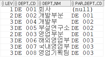 START WITH PAR_DEPT_CD IS NULL -- 시작 위치를 정함